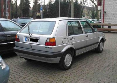 Volkswagen (VW) Golf II 1,6 GL ---------------------------------- Meinen Golf habe ich mir dann im Februar 2005 als vermeintliches Winter- und/oder Schlechtwetterfahrzeug für -pussyhafterweise- eher nicht zweiradtaugliches Wetter gekauft. (...und er hat dann jetzt auch im April 2015 -diesmal allerdings, entgegen vorangegangender Termine, mit geringen Mängeln- die Freigabe für die nächsten zwei Jahre bis 2017 bekommen!) Soweit ich weiß, ist er bis jetzt auch ohne jeden Schnickschnack ausgekommen, sprich auch immer noch im Originalzustand (...wenn man mal vom Radio, den nachgerüsteten hinteren Kopfstützen, dem nachgerüsteten Laubschutzgitter, dem nachgerüsteten Komfortblinker, dem nachgerüsteten "programmierbaren" Wischrelais und dem ebenfalls nachgerüsteten Kaltlaufregler von Twin-Tec -mit dem ich steuermäßig auf D3 komme- absieht!), und so soll es dann eigentlich auch weiterhin bleiben (...außer vielleicht doch noch mal mal ein Paar Seitenblinker?).